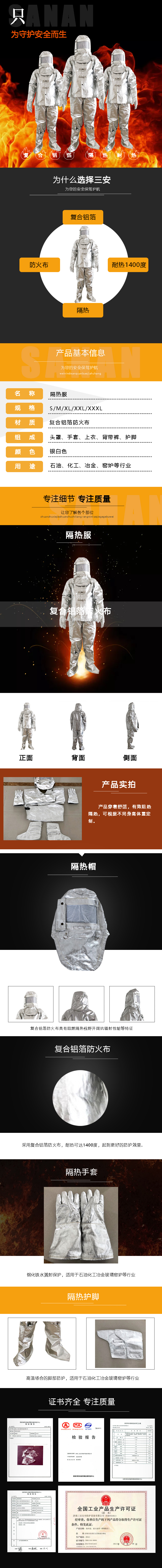 0531-66586878隔熱服也叫熱防護(hù)服,是重要的個(gè)體防護(hù)裝備,指在接觸火焰及炙熱物體后能阻止本身被點(diǎn)燃、有焰燃燒和陰燃,保護(hù)人體不受各種傷害的防護(hù)服,分為石油、化工、冶金、玻璃等行業(yè)高溫爐前作業(yè)的防護(hù)服裝和用于消防、森林防火的消防服。