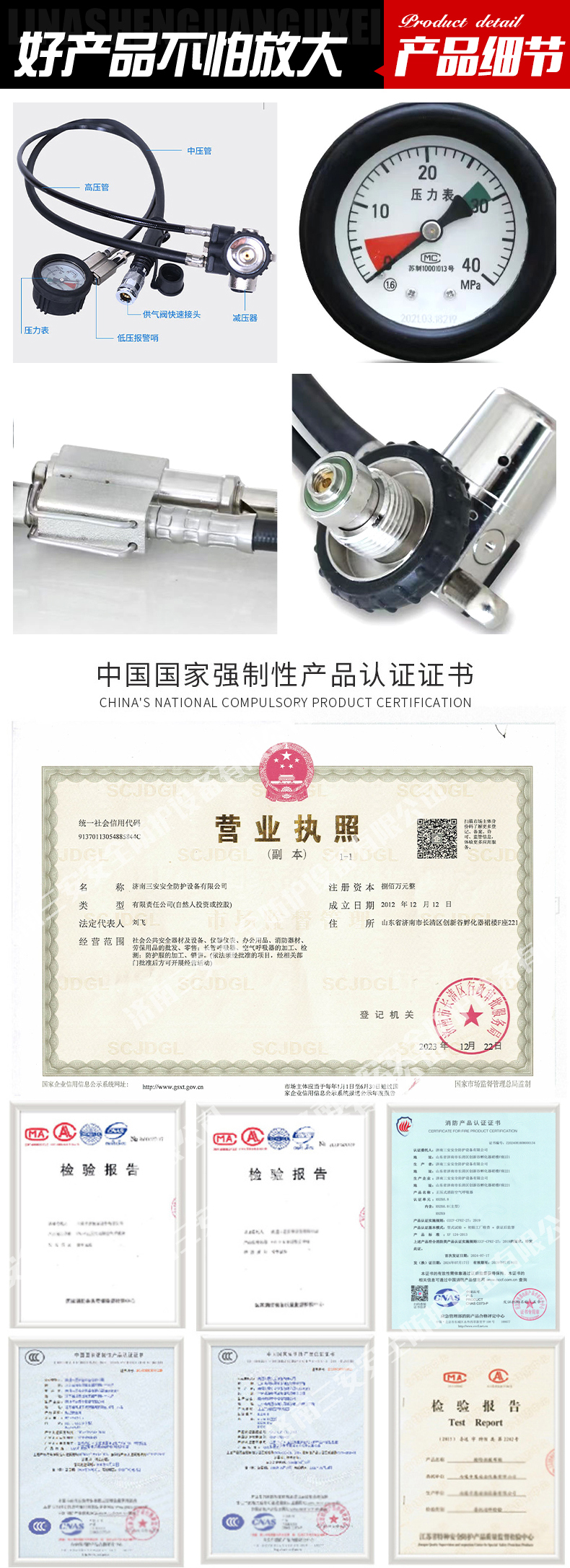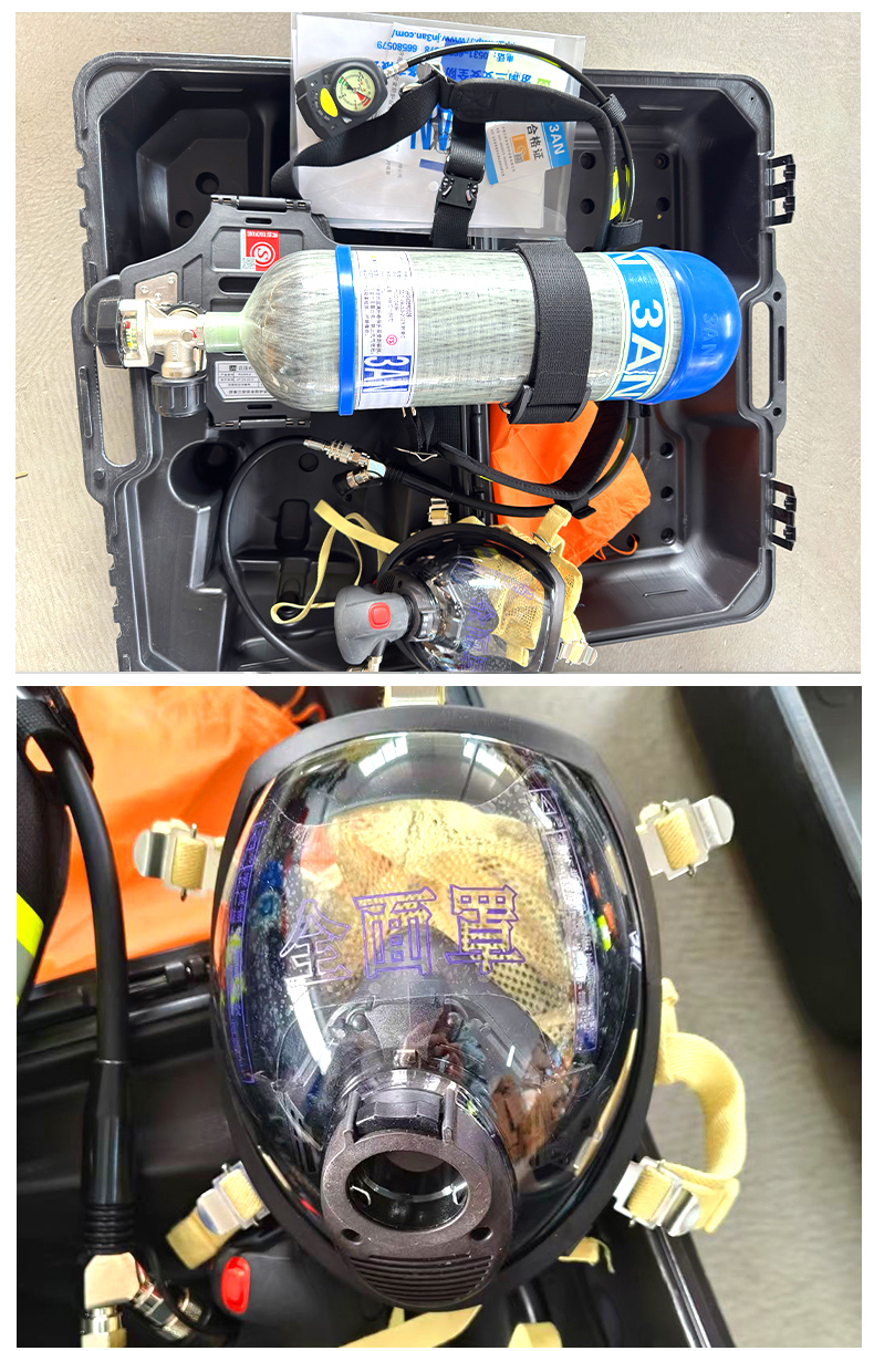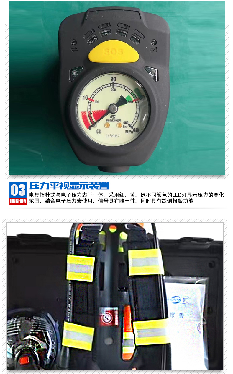 消防認證、一罐一碼,證書齊全;球形設(shè)計視野更清晰,具有防霧功能,口鼻罩采用安全無毒硅膠設(shè)計與面具貼合舒適,無異味;電集指針式與電子壓力表于一體,采用紅、黃、綠不同顏色的LED燈顯示壓力的變化范圍,結(jié)合電子壓力表使用,信號具有唯一性,同時具有跌倒報警功能;
